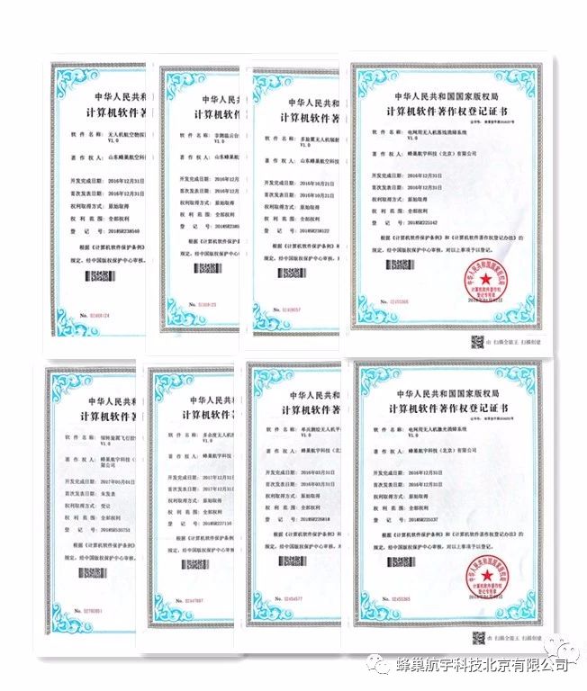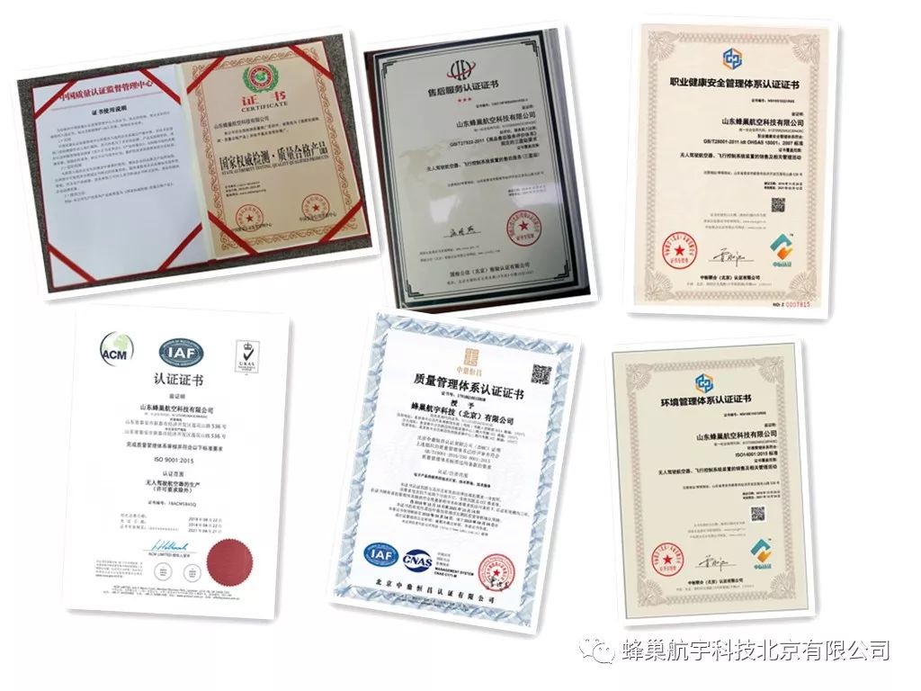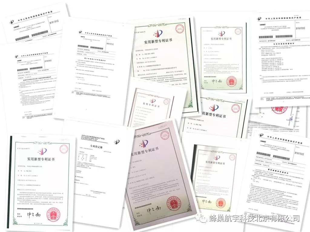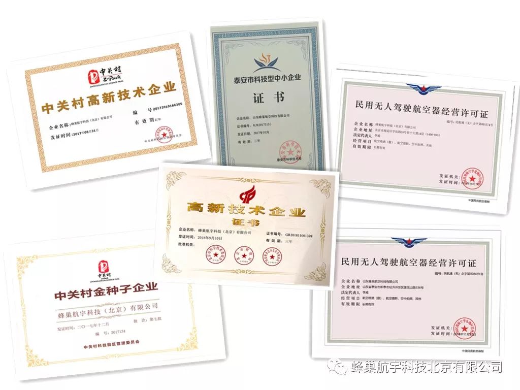 2018年是蜂巢航宇飞跃发展的一年,通过各领导层与全体同仁共同努力,公司日渐发展壮大,获得了诸多成果。在2017年获得的“中关村高新技术企业”、“中关村金种子企业”、“百公里跨海证书“的荣誉称号后,再创佳绩。2018年公司被评为“国家高新技术企业”,荣获“民用无人驾驶航空器经营许可证”资质证书,通过并取得“国家权威检测·质量合格产品”、国际“ISO9001 质量管理体系”、“OHSAS18001职业健康安全管理体系认证”、“ISO14001环境管理体系认证证书“、“售后服务认证”认证证书,申请获得专利18项、软件著作权9项。