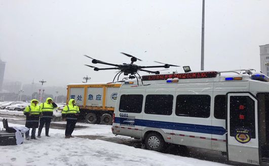 慧明捷无人机反应快,机动性强,在冰雪低温的极端环境下仍然稳定飞行,通过无人机搭载的高清变焦摄像云台和红外摄像云台,不管白天还是黑夜都可进行长时间大面积高空巡查,利用慧明捷高清实时图像传输系统,把现场冰雪覆盖情况画面实时回传到现场的应急指挥车和市城管指挥中心的大屏上,领导根据周围冰雪覆盖情况和清扫情况,确定冰雪覆盖安全隐患严重区域,明确分配各部门任务职责负责区域,根据各区情况进行远程指挥调度应急设备和物资,大大提高应急处置的工作效率。