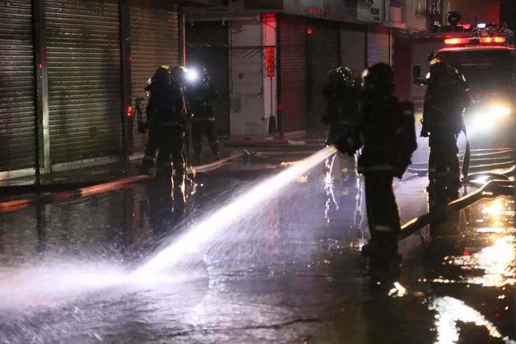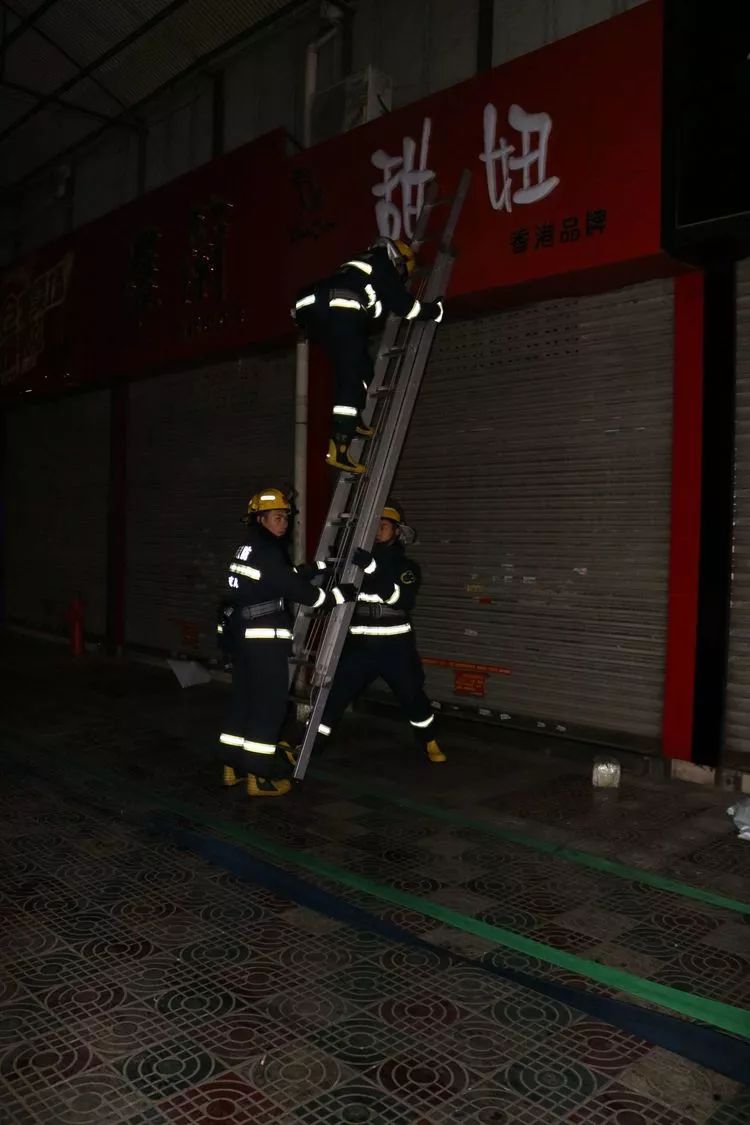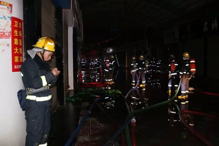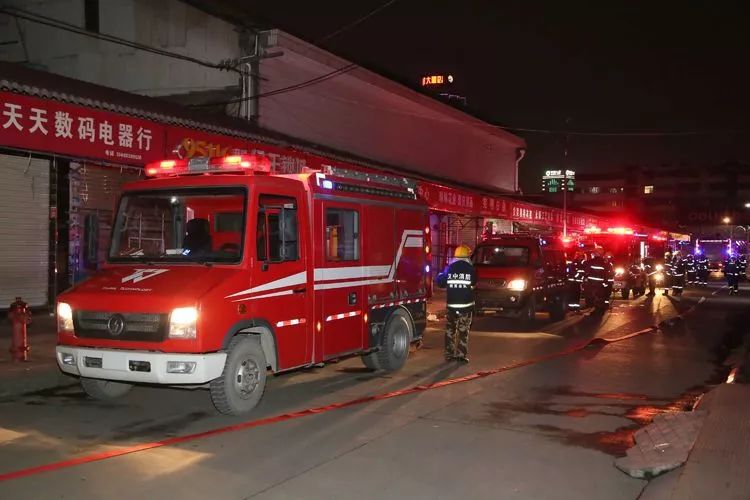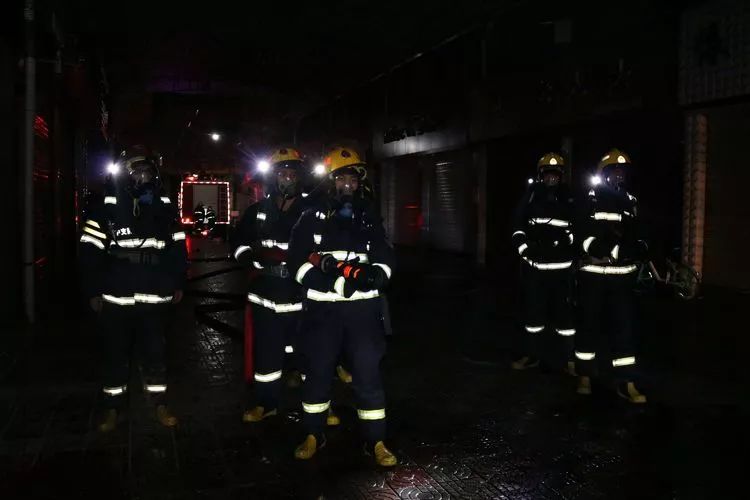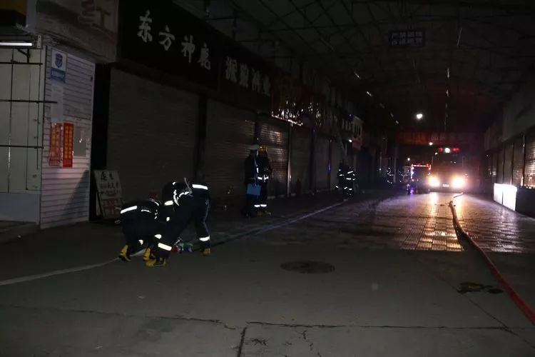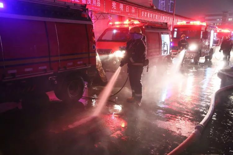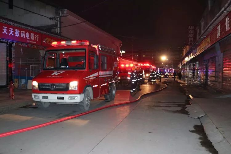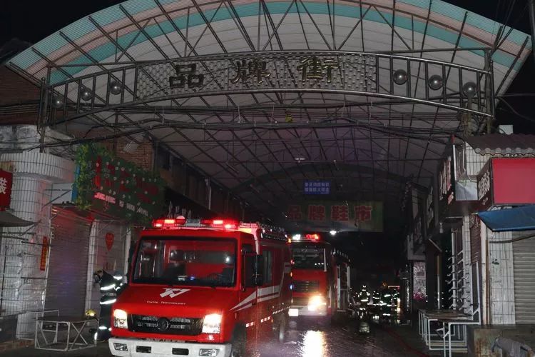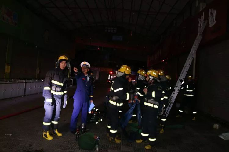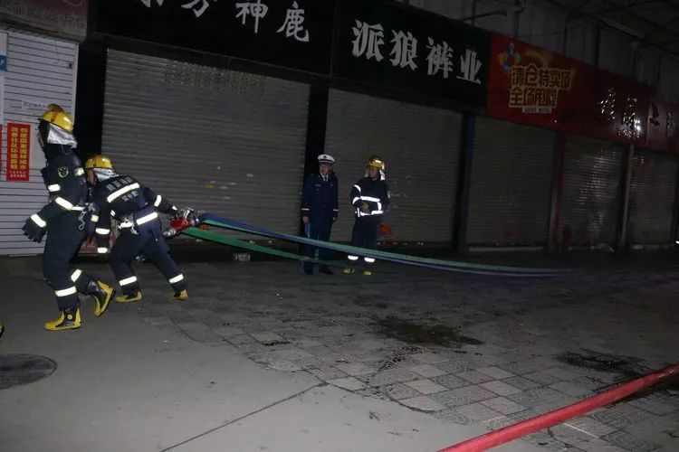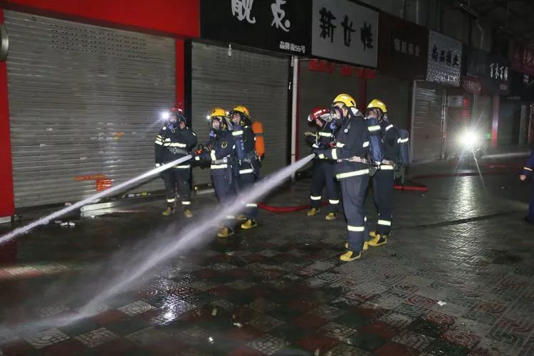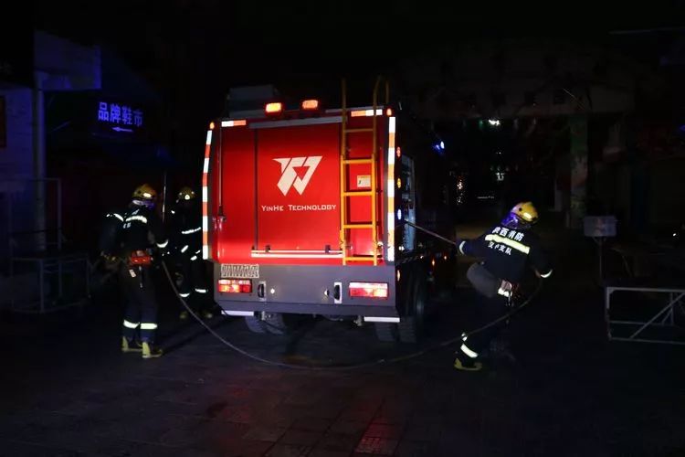21时20分,各方增援力量相继到场后,成立现场指挥部,立即进行作战力量部署,灭火战斗全面打响。“协同化”作战,攻坚组全力救人灭火全勤指挥部下达作战命令:特勤中队主战车停靠在商贸市场南侧,利用6米拉梯营救二楼平台被困人员,组织三个攻坚组佩戴个人防护装备进行内攻灭火,利用高喷消防车从外围出水打压火势,并占据消火栓进行供水;滨江路中队停靠在商贸市场西侧,占据消火栓保障兴汉路中队火场供水;南郑中队2辆水罐消防车就近占据水源,为前方特勤中队不间断供水。