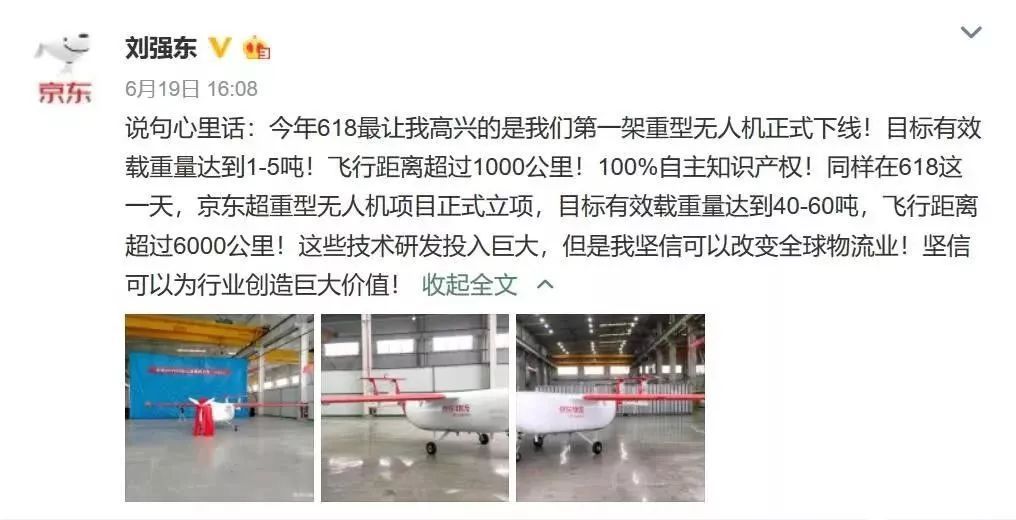 在京东618促销创造1600亿元新高之后,刘强东却宣布:今年618最让他高兴的,是京东第一架重型无人机正式下线!