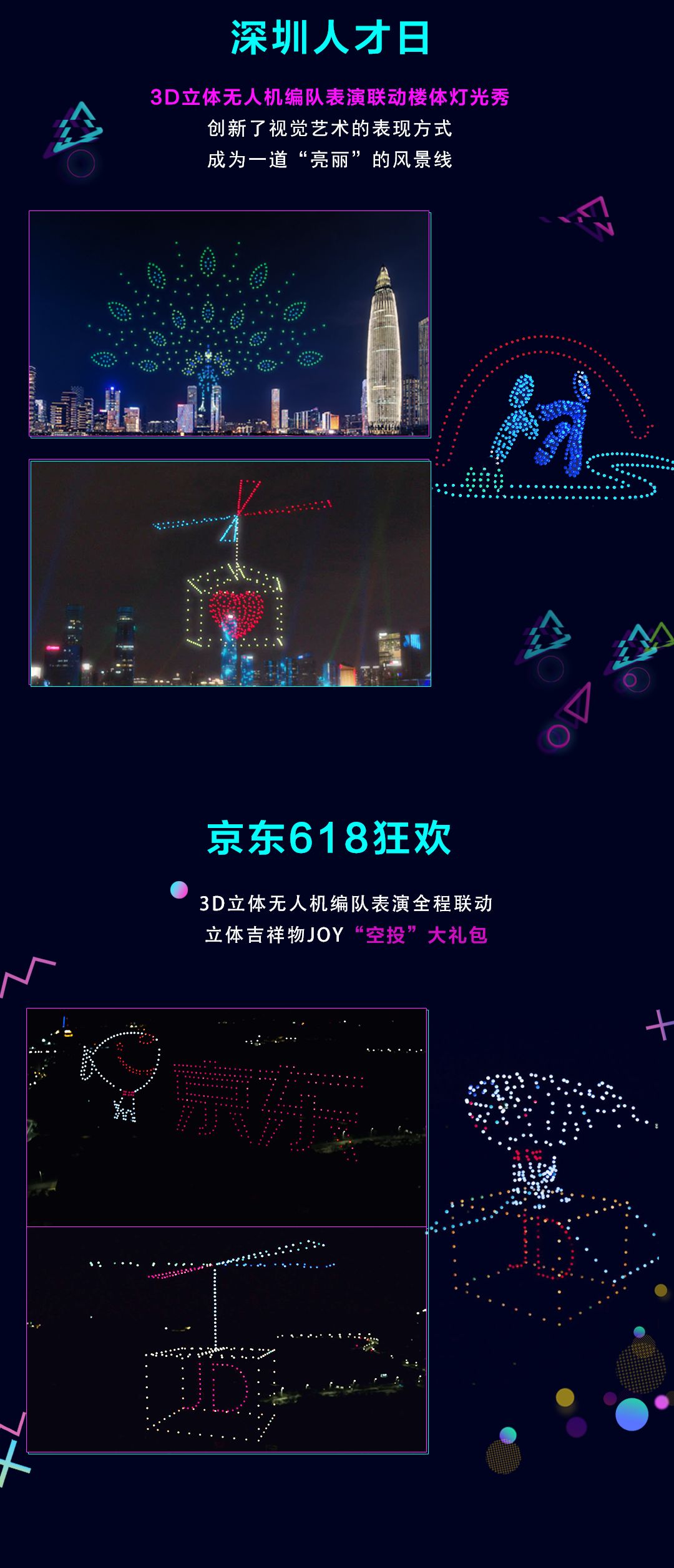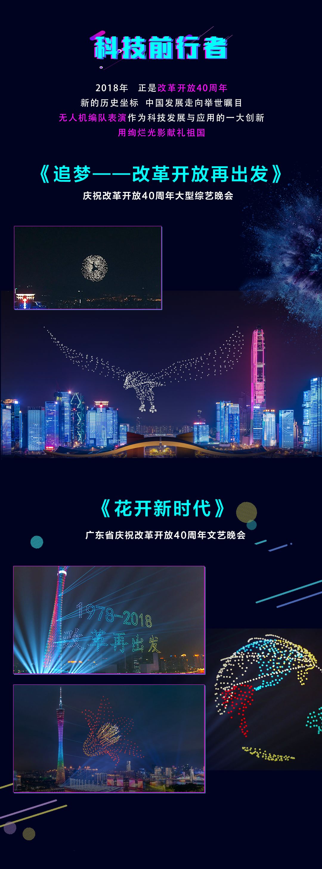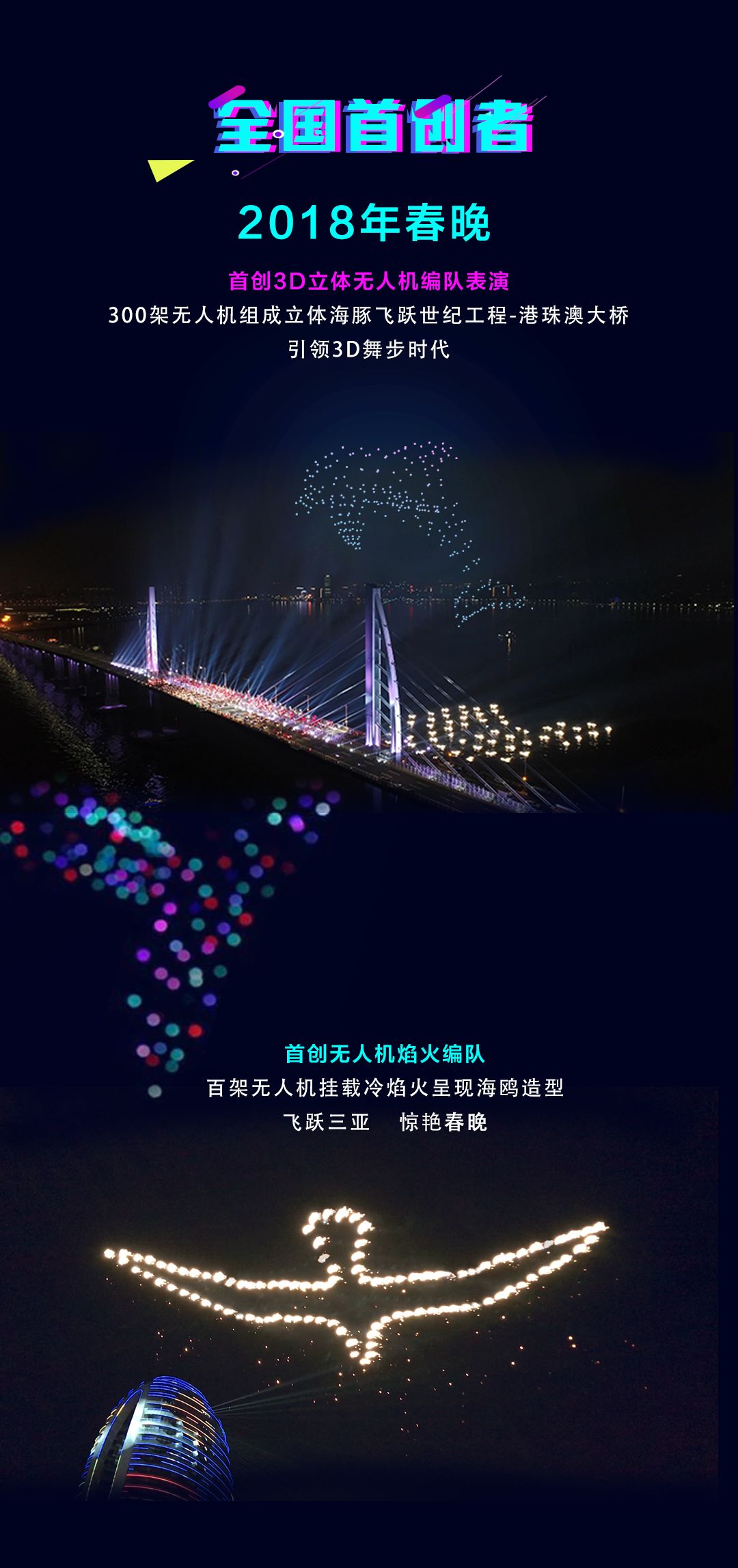 2018年,我们全国首创3D立体无人机编队表演,开辟3D舞步时代;
