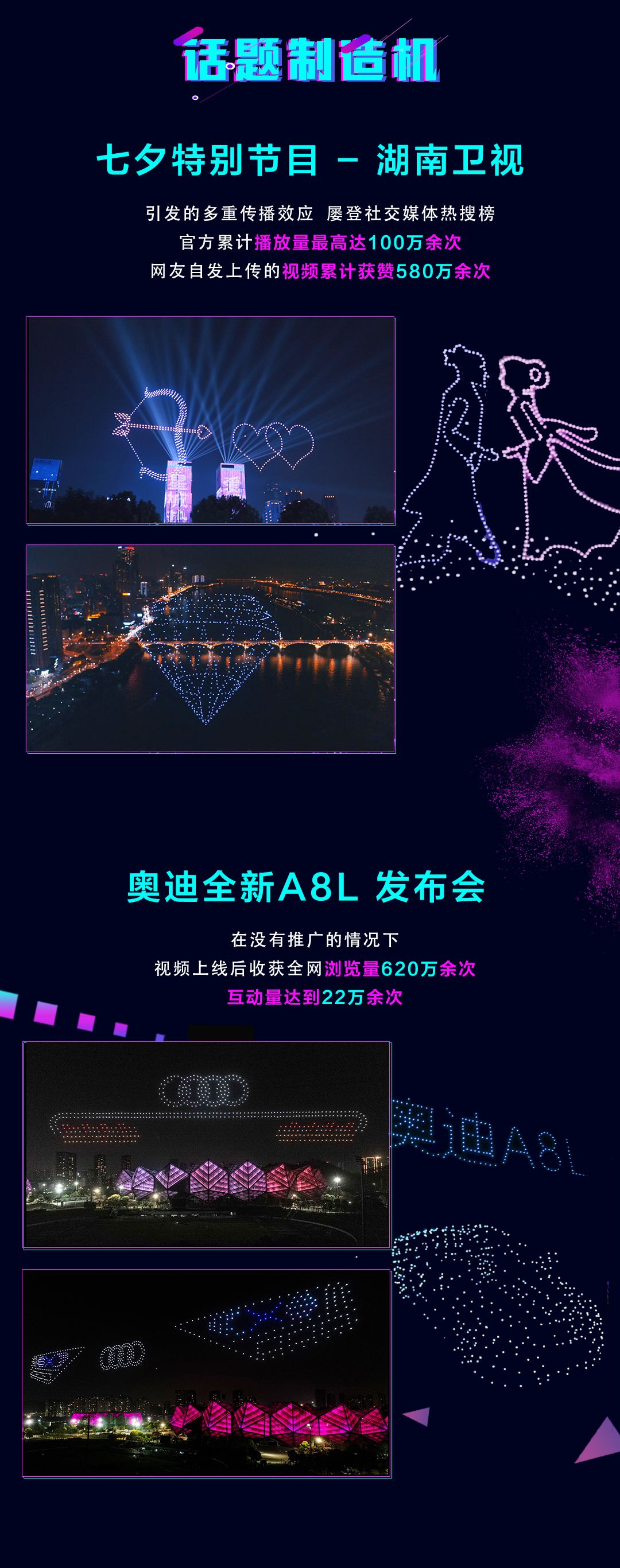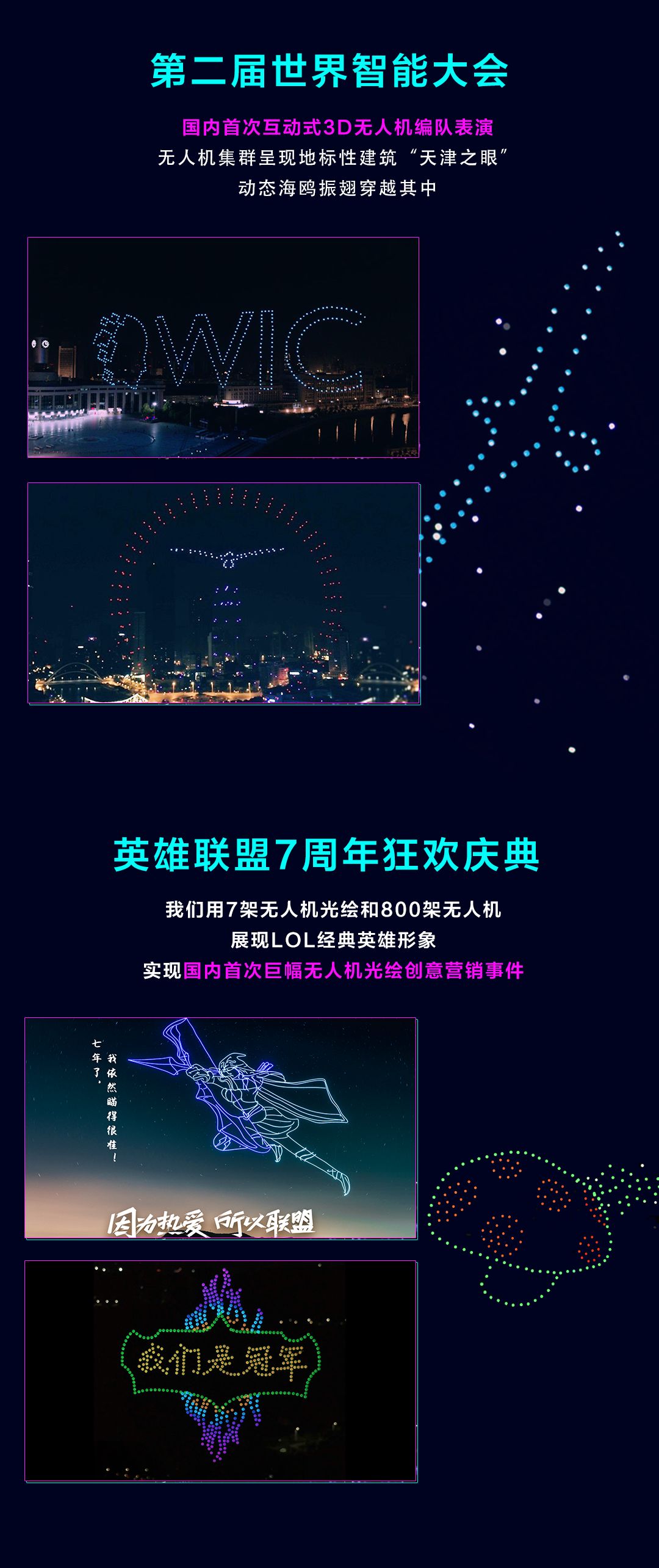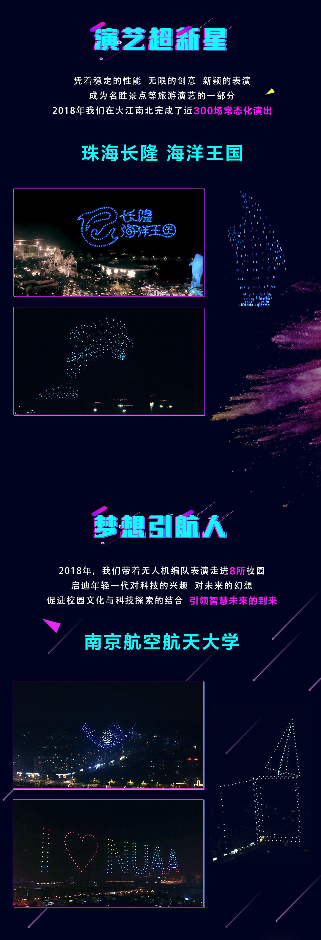 2018年,我们全国首创3D立体无人机编队表演,开辟3D舞步时代;