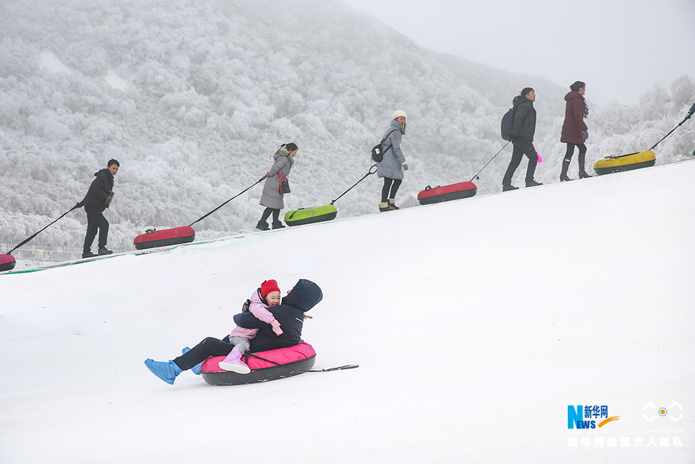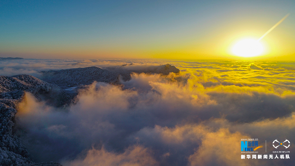 金佛山位于重庆市南川区,冬季冰雪期长达4个月。随着隆冬渐深,金佛山的雪越大,天上飞琼万花落,地上白雪覆大川,壮观的雪景让人叹为观止。图为无人机航拍金佛山冬晨,茫茫雪山放光芒。