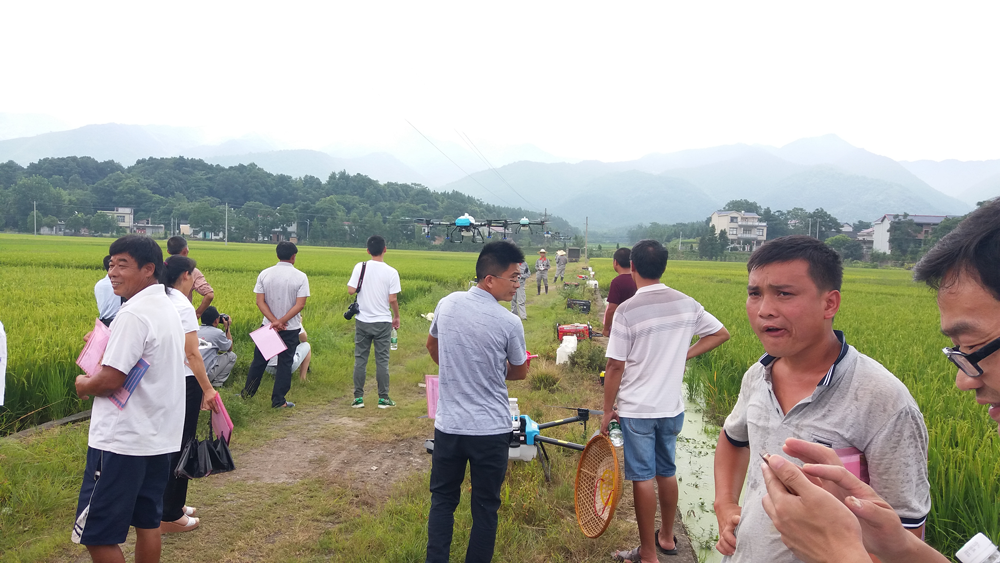 演示推进会当日引来了各乡镇上百名农机员及村民的围观。今年已经59岁的老李和乡亲们站在地头儿,好奇地看着两架植保无人机飞过稻田,不到一晌的工夫,就完成了施药作业。老李兴奋的对着我们说“今年我种了100多亩水稻,以前仅喷洒除草剂,就要聘请2个人连续干几天才行。看这无人机作业估计不到一天就能完成,现在的科技可真是发达,没想到还能帮助我们这些农民。”