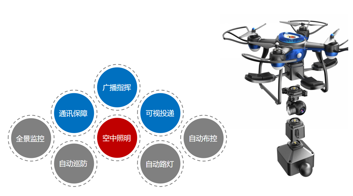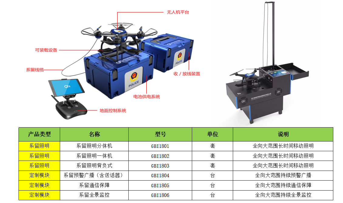 经多年自主研发,GBI空中照明系留无人机(照明范围三千平方,时长四小时以上),配合广播指挥、通信保障、全景监控等多种模块,解决了夜间野外、复杂地形、危险水域、大范围、移动照明这一难题,并以其安全可靠、携带方便、操作简单、实用高效深受用户好评,广泛为其公安消防、部队武警、林业环保、电力水利、石油石化、应急救援、海事搜救、地勤人员等多个行业提供可靠的照明保障。有效完善补充其现有行业装备,提升了夜间突发事件和应急救援中的处置能力和效率。