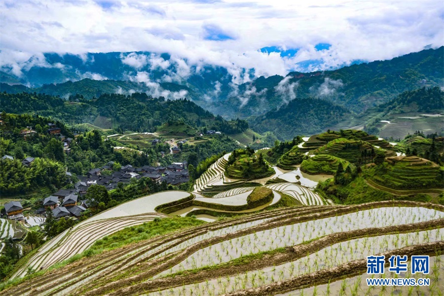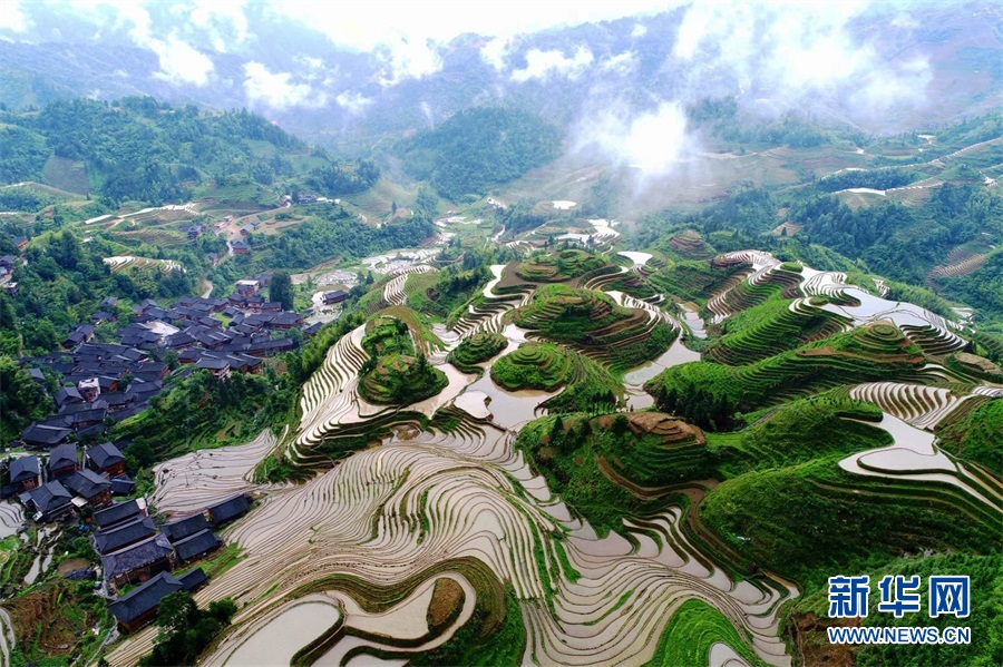 开春,灌满水的层层梯田映衬天光,如串串银链山间挂。新华网发 潘志祥摄