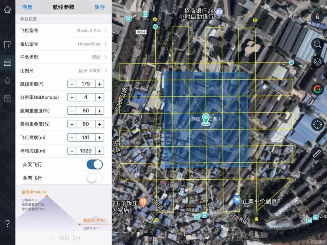 根据建模及精度要求,航线采用Mavic2Pro默认的交叉倾斜航线设计,分辨率为4cm,飞行高度141m,航向重叠度为80%,旁向重叠度80%,预计里程8.17公里;飞行过程采用全程飞行,共计飞行1架次,采集影像826张。
