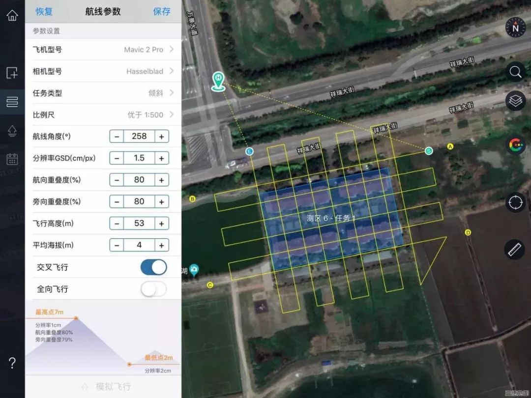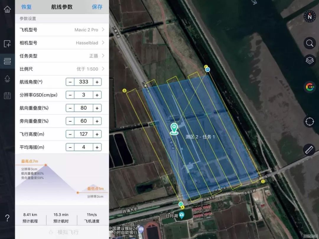 基于无人机管家iPad版进行自动航线设计,为满足1:500精度需求,此次飞行设计地面分辨率3cm,飞行高度127m,航向重叠度80%,旁向重叠度60%,系统将根据参数设置自动生成最佳航线。