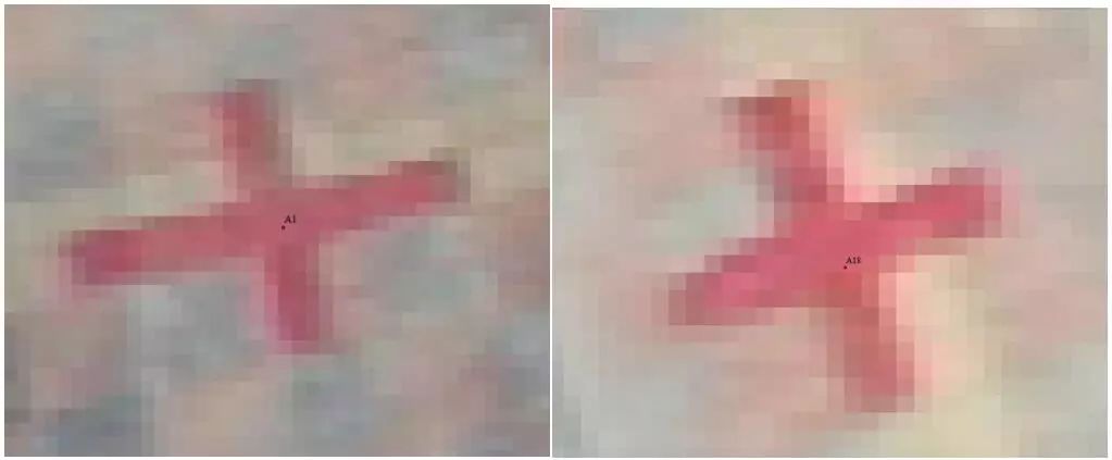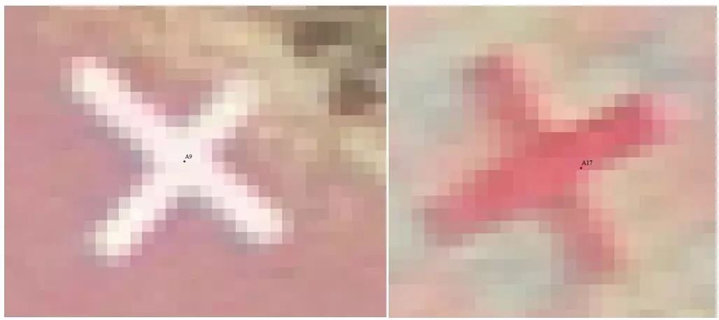 将DOM影像与控制点进行套合,误差均在2个像素(6cm)以内。部分点位套合如下: