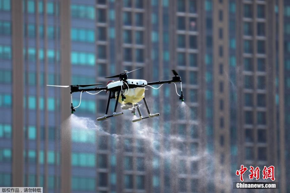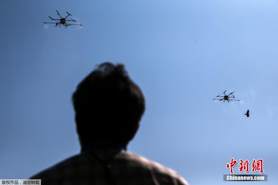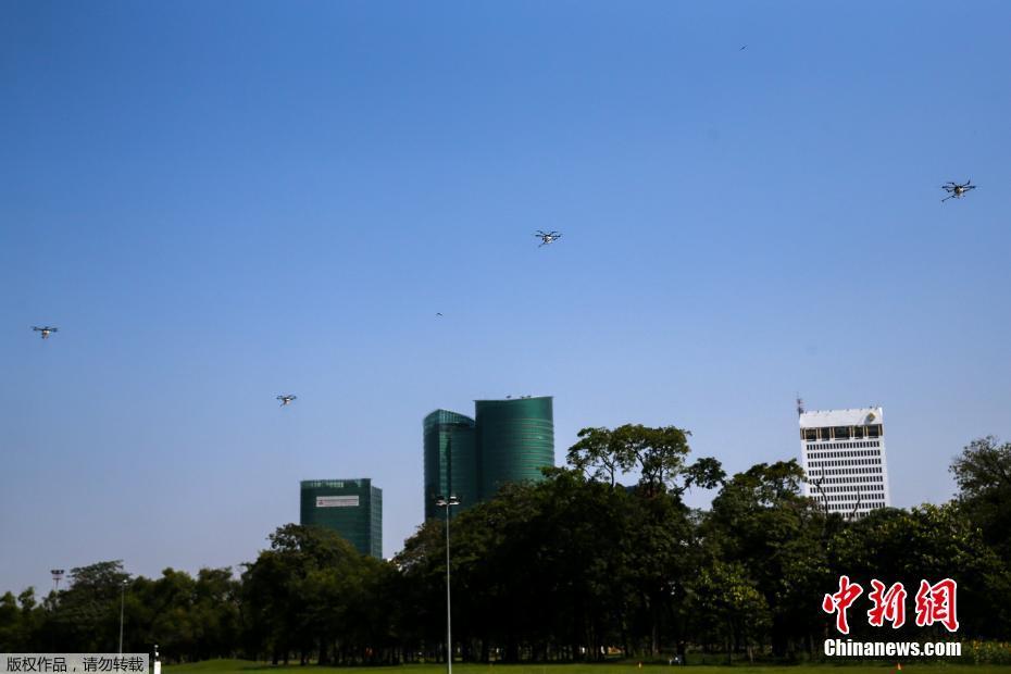 当地时间1月22日,泰国曼谷,无人机操作者飞无人机在空中喷洒化学品,应对空气污染。