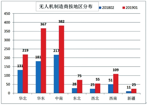 对比无人机注册数量,我国民用飞机注册数量为7113架(截至2019年1月1日),每年的注册量为800多架。无人机实名登记系统则应用了“互联网+”等新技术和以用户为中心的新思维,从而实现了比民用飞机超出多个数量级的登记数量。全国无人机注册厂家1232个,无人机型号3521个,比2018年2月的644个厂家和2606个型号有大幅增长,这也反映出了我国无人机工业发展迅速,是未来中国制造的重要组成部分。
