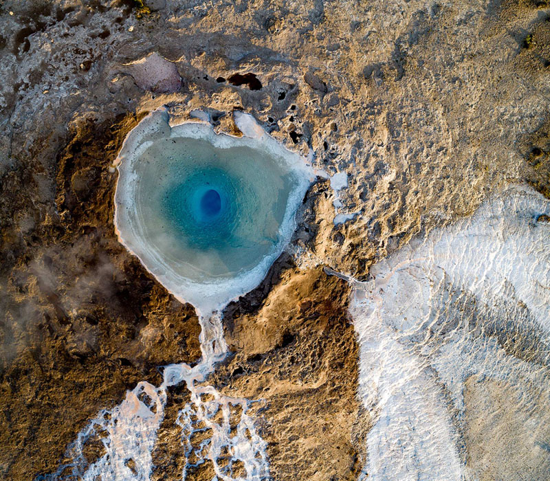 除这些外,画面还记录下了位于西班牙南部皇家港加的斯那鳞次栉比的废弃盐池、法国卡马格国家公园如粉色花海一般的盐池、瑞典阿克斯冰面上的玫瑰状冰花以及冰岛那幽蓝深邃的间歇泉眼。