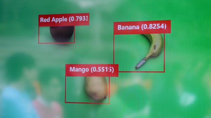 在下图中,您可以看到学生构建的AI模型如何标记不同的水果,并在每个水果旁边添加一个数字,以指示结果是否真的可信。