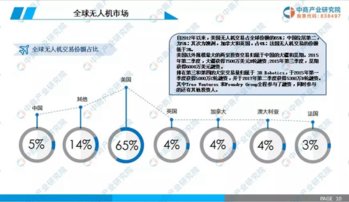 自2012年以来,美国无人机交易占全球份额的65%;中国位居第二,为5%;其次为澳洲,加拿大和英国,占4%;法国无人机交易的份额低于3%。美国以外规模最大的两宗投资交易归属于中国的大疆和昊翔。2015年第二季度,大疆获得7500万美元B轮融资;2015年第三季度,昊翔获得6000万美元融资。排在第三和第四的大宗交易量归属于3DRobotics,于2015年第一季度获得5000万C轮融资,并于2017年第二季度获得5300万D轮融资。其中TrueVentures和FoundryGroup全程参与了融资,同时参与的还有其他投资人。本章节从全球无人机到中国无人机详细的分析了无人机的市场现状。
