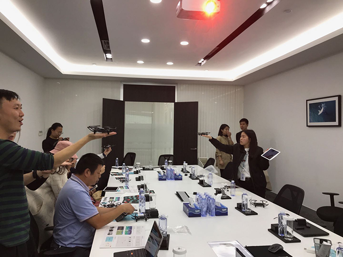 经过多次试飞,老师们大多在10几分钟后能够上手,开始体验这款无人机更多的飞行模式。例如弹跳、一键环绕、一键360、全向翻滚、抛飞和一键飞远等人机互动较强的模式。根据各位老师在现场的反馈来看,他们认为这款产品的飞行操作比较简单,容易上手,互动性也比较强,总体来说是一款不错的产品。