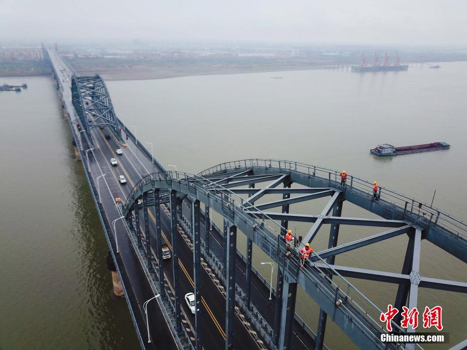 九江长江大桥是京九线上的“咽喉”,春运期间,列车行车密度大,九江桥工段大桥检查班负责对大桥设备进行“诊断把脉”,及时发现设备病害,为维修与大修提供真实有效的资料和数据。 图为无人机航拍下的九江长江大桥上车辆川流不息,最下方就是滚滚长江水。丁波 摄