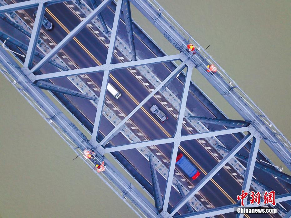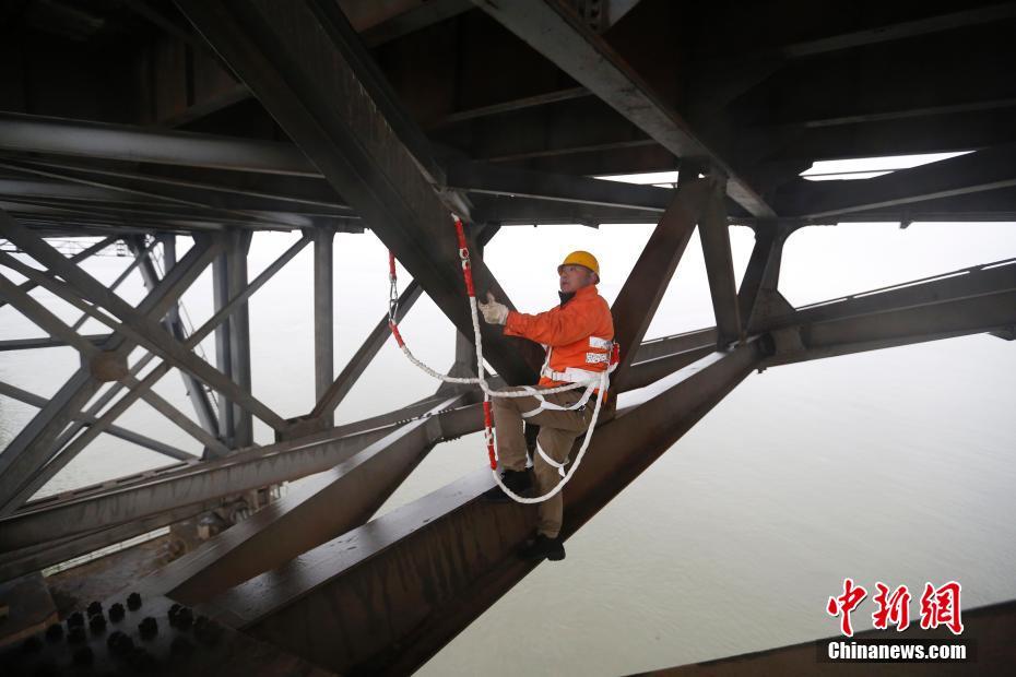 绑着安全绳在九江长江大桥上进行检修的桥梁工。肖尧 摄