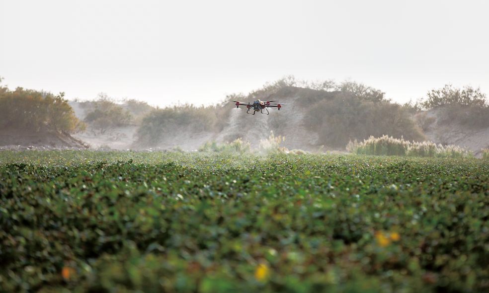 极飞植保无人机为棉田喷洒脱叶剂。棉花的叶子脱光后,再用机械进行统一采收,可大大提高采棉效率。