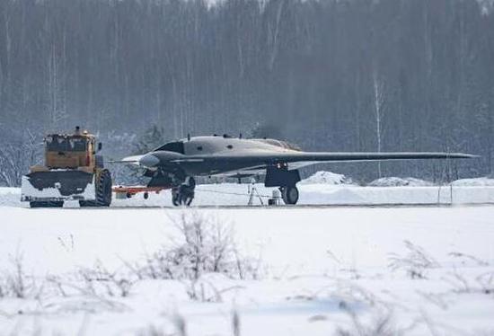 在无人驾驶作战飞机领域,俄罗斯似乎走在了老对手美国前面。1月下旬,俄社交媒体平台“VK”上出现的一组低分辨率照片显示,在新西伯利亚地区某处白雪皑皑的跑道上,一辆牵引车正在拖拽一架外形独特的无人机,机翼大概有15米宽。