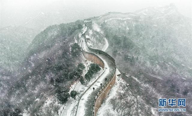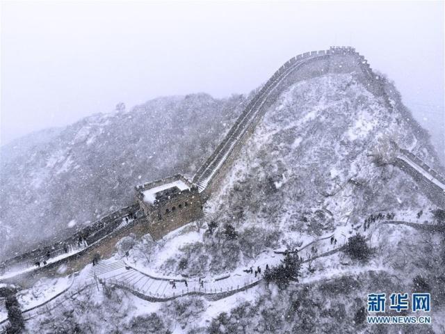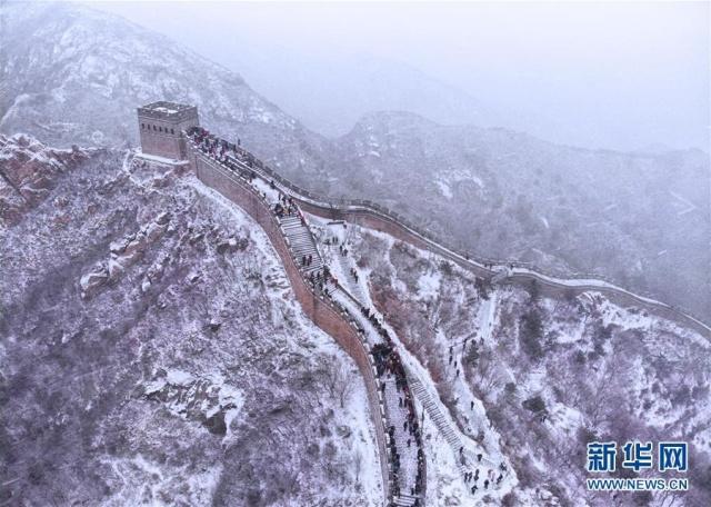 2月14日,游客冒雪在北京八达岭长城景区游览(无人机拍摄)。 当瑞雪降临,祖国大好河山万里银装,一片素裹,宛如仙境。新华社记者带您从天空的视角领略雪国的风光。 新华社记者 才扬 摄