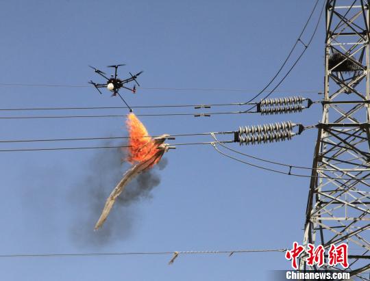 2月15日,青海电网首用喷火式无人机清除输电线路异物。