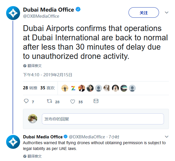 据《纽约时报》报道,“未经授权的无人机活动”导致迪拜国际机场在周五上午停飞了30多分钟的所有出境航班。停止起飞时间从当地时间上午10:13持续到10:45,只有入境航班能够在世界上第三繁忙的机场降落。阿拉伯联合酋长国相关法律明确禁止在机场5公里范围内飞行无人机。