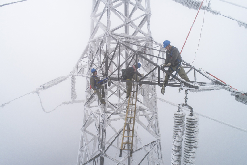 国网武汉供电公司工作人员爬塔准备进行抢修作业(2月12日无人机拍摄)。