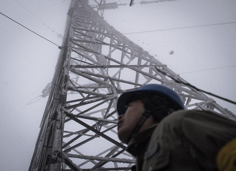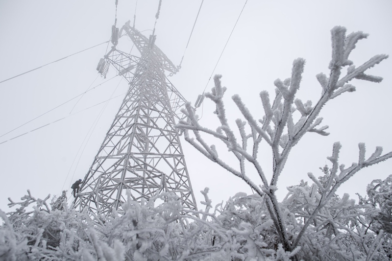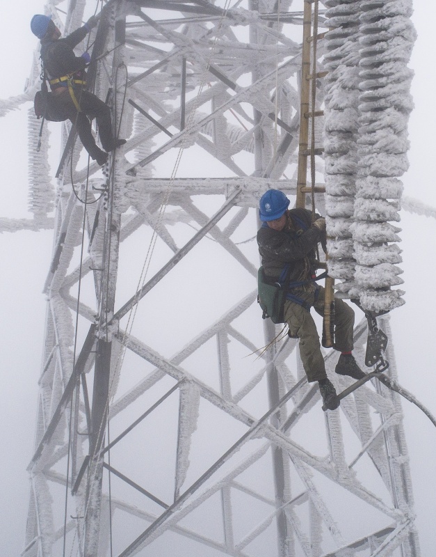 国网武汉供电公司工作人员爬塔准备进行抢修作业(2月12日摄)。