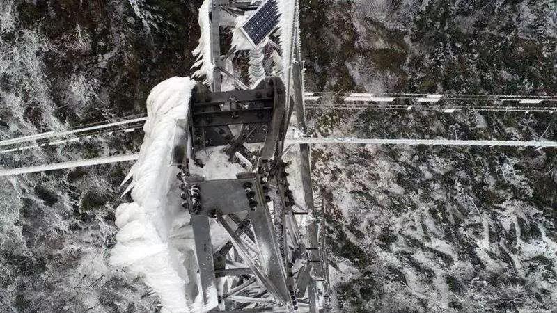 作业期间,对陈涛他们来说遇到恶劣的天气已成了习以为常的事情。因为冬季温度过低,杆塔会出现大面积结冰的情况,需要拍摄的地方,比如每一个挂点、绝缘子传等部位都被冰包裹住完全看不清,但这种情况也需要拍摄照片采集数据,以查看结冰的严重程度。陈涛说:“每次飞机飞完下来,桨叶都会有一层薄冰。”