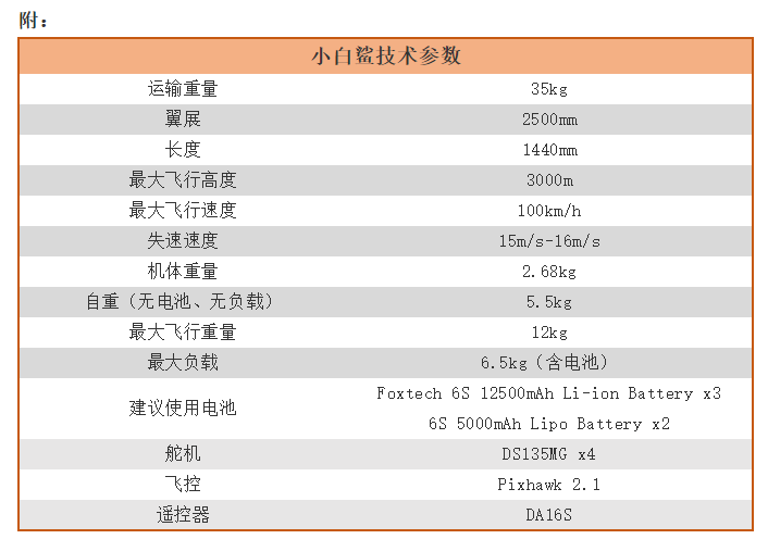 小白鲨的失速速度为15m/s-16m/s,最大飞行速度约100km/h。除了电池、电机、电调、螺旋桨和其它必要的设备,还有1.5-3kg有效负载用于携带测绘相机、云台吊舱等设备。