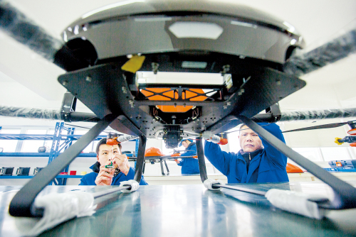 2月13日,湖北航天双菱物流技术有限公司员工正在组装新型高端植保无人机。去年,航天双菱与北京蜂巢科技公司合作,成功研发2个系列的高科技植保无人机,今年刚投产就订单不断,目前已接到黑龙江、江苏、福建等地的订单共计350台。据悉,这是我国植保无人机领域首个军民融合项目。