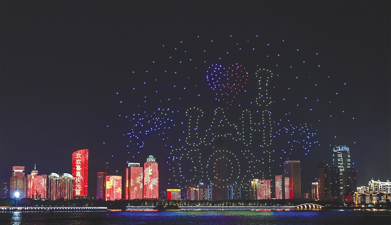 2月19日晚,海口上演无人机灯光秀,为市民游客送上元宵节的温馨祝福。本次无人机灯光秀主题有“繁星点点耀海口”“椰城元宵人团圆”“花开富贵鹈鹕飞”“海口张灯结彩迎四方宾客”等。