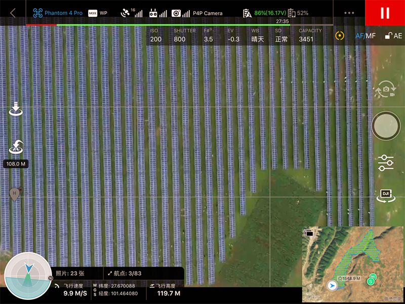 采集正射影像的过程会比较漫长。某光伏电站的1期和2期的采集时间大约是105分钟,3期的采集时间大约是84分钟。趁这个空档,把遥控器放在一个面对航线的高点,晒会儿高原的太阳吧。