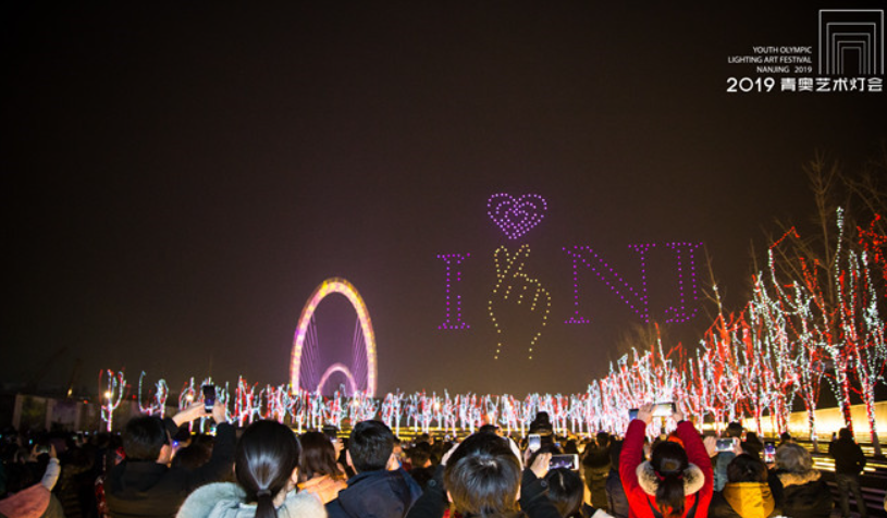 2月20日晚,在2019青奥艺术灯会主会场,一场全新编排的“新年”主题无人机灯光秀再次燃亮河西•建邺夜空,吸引近四万名游客来此观看。不到十分钟的时间里,比心南京、飞猪、灯笼、中国结……一个个令人惊艳的图案不断变幻,引得现场观众连连惊呼。