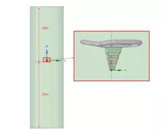 仿真分析无人机在开放空间飞行时的流场,需要选取足够大的空间作为流体计算域(如图2所示),以消除计算域边界的存在对无人机流场的影响。考虑到无人机在飞行时,旋翼驱动产生的流动方向主要是上下方向的,因此选用圆柱形的计算域空间,其半径为10m,高度方向为45m。