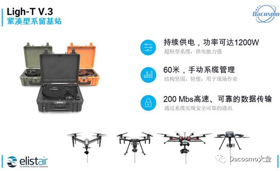 而elistair Ligh-T,做为elistair法国精锐航空公司的一款紧凑型的系留基站,不仅结构坚固,且轻便易操作。它地面供电的特点可让无人机数小时持续飞行;并可通过微系缆实现高效、安全的数据传输;60米长的系缆也让无人机可对较广区域进行实时监控,因此,elistair Ligh-T系留基站与大疆经纬200无人机形成完美组合,在法国、美国等举办的国际大型活动中多次被采用,进行长达数小时的持续安保监控,或者电视实况转播。它的扩展功能让无人机行业同仁以前敢想却不敢做的梦想成为现实,也为无人机应用带来新的商机!