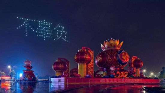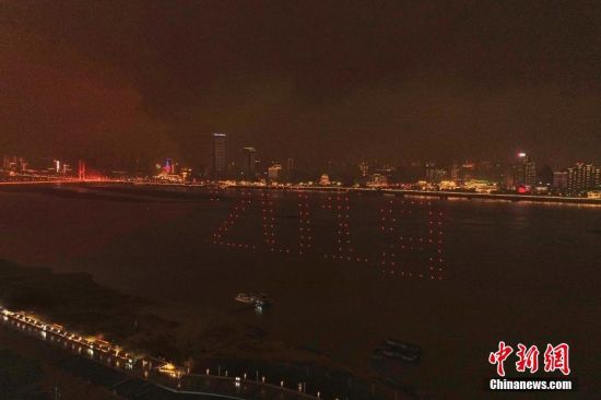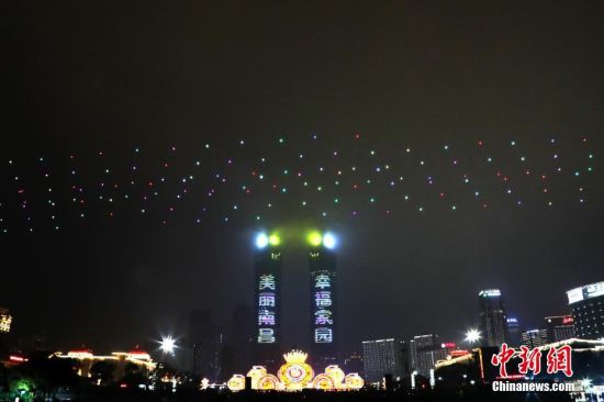 2月22日晚,江西南昌红谷滩新区秋水广场,由百余架无人机组成的编队上演了一场“灯光秀”。