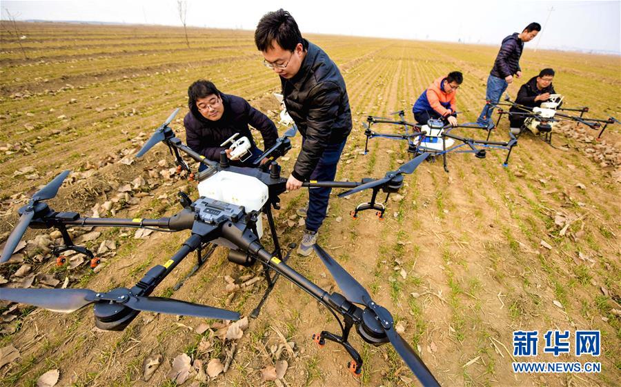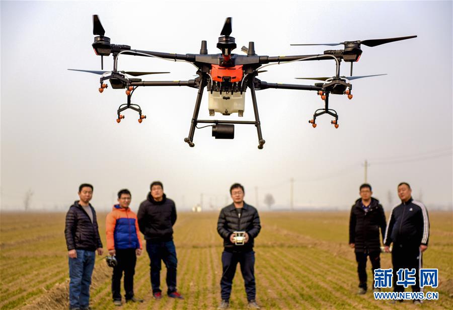 2月25日,无人机教员(右三)在衡水市冀州区徐庄乡北榆林村为村民做飞行示范。春耕将至,河北省衡水市冀州区无人机培训学校通过田间实践、现场指导等方式,加紧对学员进行植保无人机操作技能培训,帮助他们通过考试取得驾驶执照,助力即将到来的春耕春种。