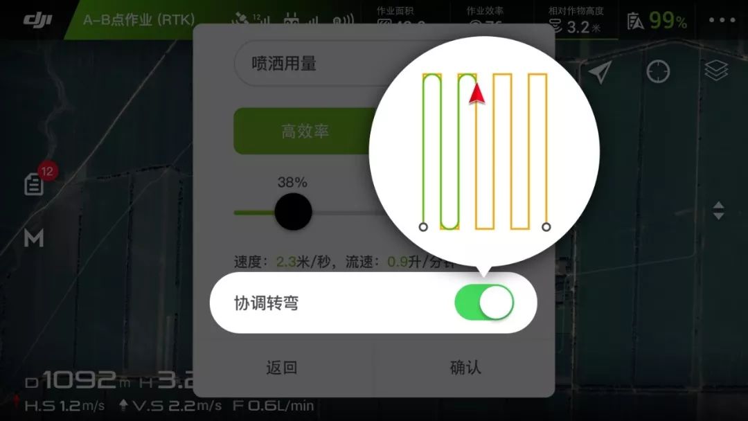 大家应该记得在使用 MG 系列植保无人机作业时,可以打开一个名为「协调转弯」的模式,能使作业效率提升 20%。这个模式原理在于,将无人机在不同航线之间切换时的两个 90° 转向动作优化成两个圆弧形轨迹,让无人机可以以更高的速度切换航线,从而提升作业效率。