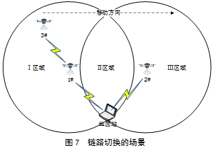 在室外进行快速链路切换实验,场景如图7所示。1、2、3号无人机和地面站均以Ad Hoc组网方式连接在同一个无线网络环境中,地面站到1、2号人机均是1跳可达,到3号无人机需要2跳,图中圆形区域表示无人机的通信范围。1、2号无人机固定悬停在彼此的通信范围之外,地面站在二者通信范围交集的Ⅱ区域下方。3号无人机位于1号通信范围Ⅰ区域左上远处。实验中,3号需要沿着图中标注的移动方向匀速向右飞行,经过Ⅱ区域最终到达Ⅲ区域边缘悬停,期间大约花费20 s时间。实验开始时从地面站向3号无人机持续发送ping数据包,直到3号无人机最后悬停,观察反馈的往返时间基本未出现波动。反复测试10次,结果基本一致。之后将所有节点和地面站的路由协议都换成OLSR协议,再进行与之前相同的实验。结果表明,大约在13 s出现短暂的链路不可达情况,15 s后恢复正常。反复测试10次,结果基本一致。