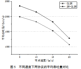 在第二组实验中,固定Hello间隔为2 s,CBR业务数据流量大小为4 kb/s,改变节点移动速度为5 m/s、10 m/s、15 m/s和20 m/s,实验结果如图5所示。其中,黑色三角折线表示SW-OLSR的实验结果,黑色方形折线表示OLSR的实验结果。实验结果表明,随着节点移动速度的增加,两个协议的平均吞吐量均在减少。这是因为随着节点移动速度增加,留给节点间彼此通信的时间减少,多数时间节点都处于孤立状态,造成数据包丢失严重,最终导致吞吐量的下降。结果还表明,在不同的移动速度下,SW-OLSR协议的表现均优于OLSR协议。在4组实验结果中,吞吐量分别提升18.1%、17.9%、17.1%和16.3%,性能的提升得益于SW-OLSR协议可以提前切换到链路质量更好的路径上,从而可以路由更多的业务数据包。这表明SW-OLSR协议在节点移动速度较快时也能具有良好的性能表现。