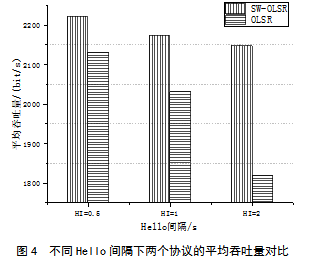 第一组实验中,固定节点速度10 m/s,CBR业务中数据流量大小为4 kb/s,Hello间隔分别取值2 s、1 s和0.5 s,实验结果如图4所示。竖线条形图表示SW-OLSR协议的平均吞吐量,横线条形图表示OLSR协议的平均吞吐量。实验结果表明,在不同Hello间隔下,使用SW-OLSR协议的平均吞吐量较使用OLSR协议的平均吞吐量均有明显提升。在 为0.5 s时,平均吞吐量提升4.3%;在 为1 s时,平均吞吐量提升7.1%;在 为2 s时,平均吞吐量提升17.9%。这表明随着Hello间隔的增大,两个协议的结果差距也在变大。这是因为Hello间隔增大,OLSR协议反应变慢,不能适应拓扑的快速变化,导致部分链路丢失而造成路由不可用,从而引起吞吐量的降低。而SW-OLSR协议引入速度加权的 ,同时使用节点位置信息,在某些情况下可以在链路丢失前提前切换到质量更优的路径上路由数据包,从而可以适应拓扑快速变化的情况,获得更高的网络吞吐量。