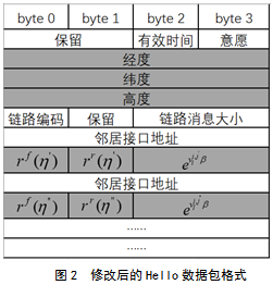 图2展示了修改后的Hello数据包格式,灰色标注的表示添加或修改的部分。首先,添加了三段4字节的空间用于存放节点的位置坐标(包括经度、纬度和高度),之后修改原有字段用于存放前向接收比、反向接收比速度加权的ETX 的分子部分。修改后的Hello消息比原始的Hello消息略大,与网络中的节点数无关。Hello消息被封装进UDP报文中,而后UDP报文又被封装进IP数据包中,之后再封装进802.11帧中。在中型大型网络中,修改后增加的字节大小与帧的总大小相比可以忽略不计。