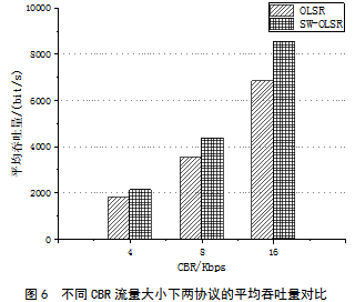 第三组实验中,固定Hello间隔为2 s,节点移动速度为10 m/s,改变CBR业务数据的流量大小为4 kb/s和8 kb/s,实验结果如图6所示。其中,格子纹条形图表示SW-OLSR协议的实验结果,斜线条形图表示OLSR协议的实验结果。实验结果表明,当增大CBR流量时,获得的平均吞吐量随之增大,这是因为增大CBR流量后,在节点有效的通信时间内传递的业务数据更多,从而可以获得更大的吞吐量。结果还表明,在不同的CBR流量下,SW-OLSR协议的表现均优于OLSR协议,在4 kb/s时性能提升17.9%,在8 kb/s时性能提升22.4%,在16 kb/s时性能提升24.8%。