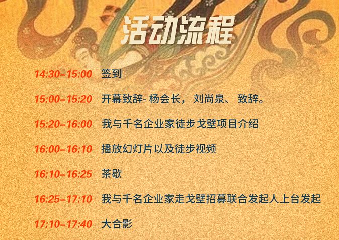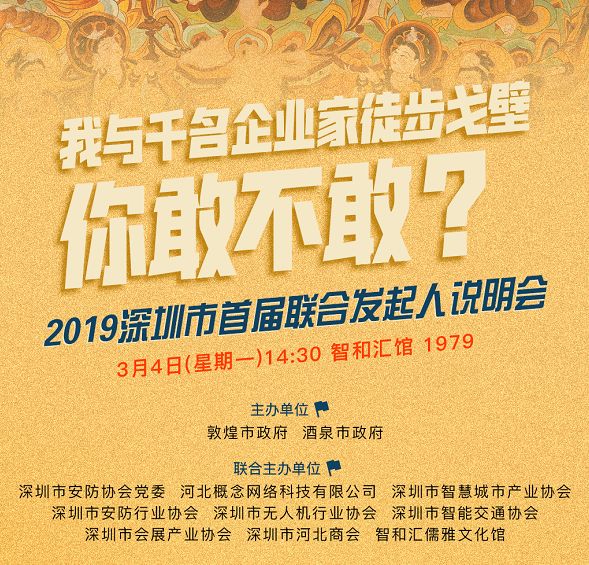 2019年3月4日,2019深圳市首届联合发起人(千名企业家徒步戈壁)说明会在深圳福田区侨香路1979文化创意园A区1栋2层智和汇馆即将举行。本次会议主题是重塑商业企业价值链,打造最新行业思维。邀请了数百名行业企业家商业精英、合伙人、投资人、行业大咖、销售模式专家出席并现身说法,为您解析商业模式,讲述挑战赛故事。还有更多关于战戈壁、延价值、破思维、塑企业、享资源的精彩内容。