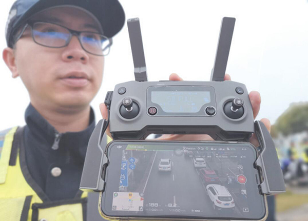 交警操作无人机进行拍摄