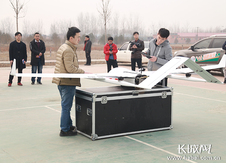 2月28日上午11点,在滹沱河花海飞行小镇的一片空地上,技术人员正在对一家翼展达4米的无人机进行飞行前的准备工作。飞行检查结束后,这架无人机由地面控制站控制缓缓升空,开始了它当天的工作任务。