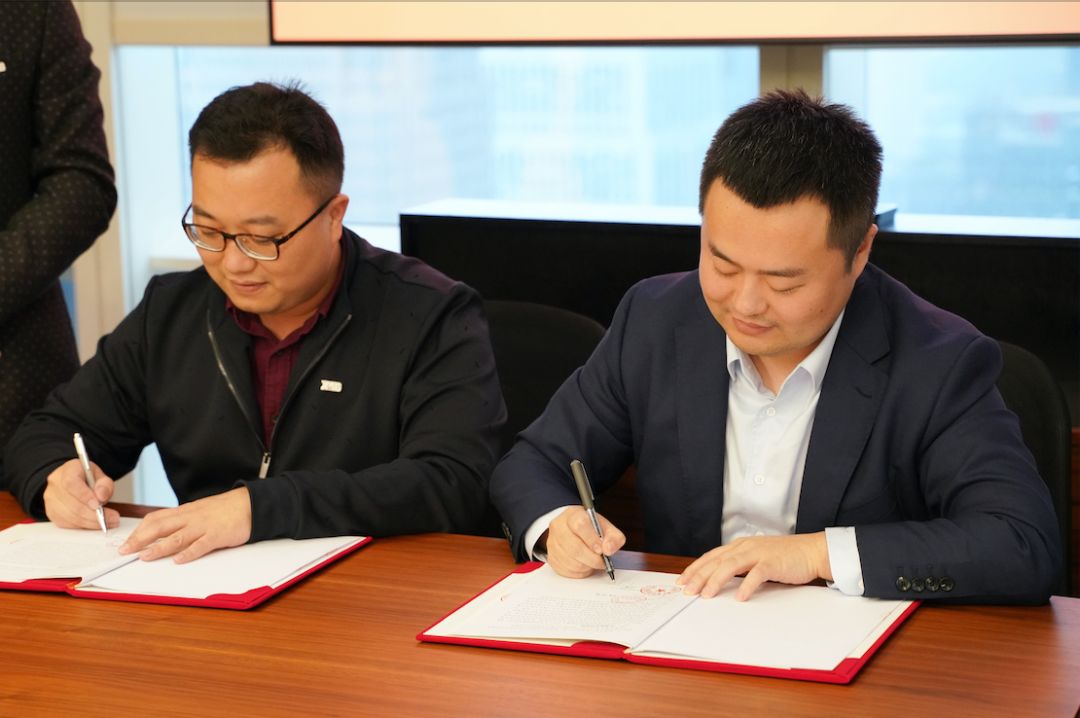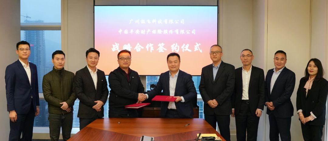 平安产险代表(右)与极飞科技副总裁陈周海(左)共同签订战略合作协议