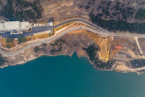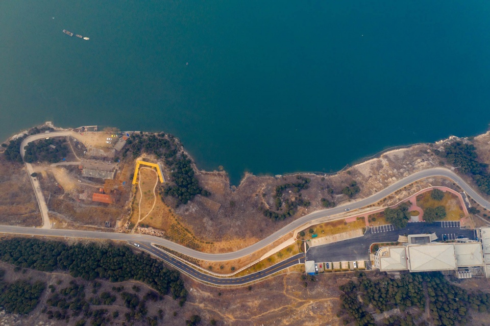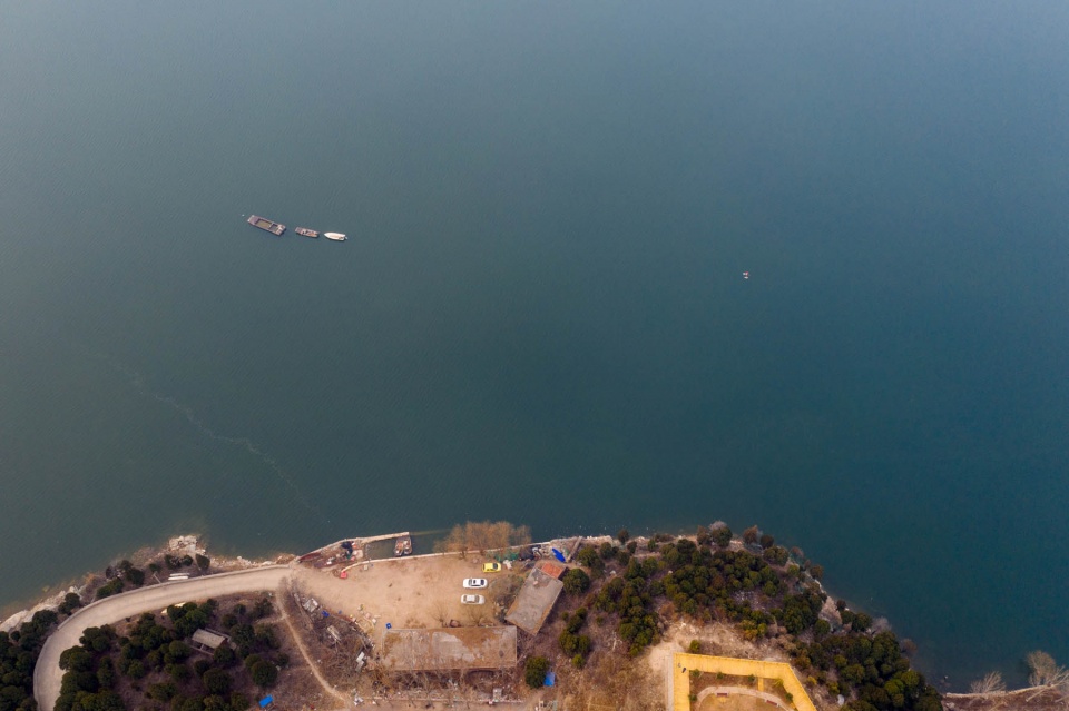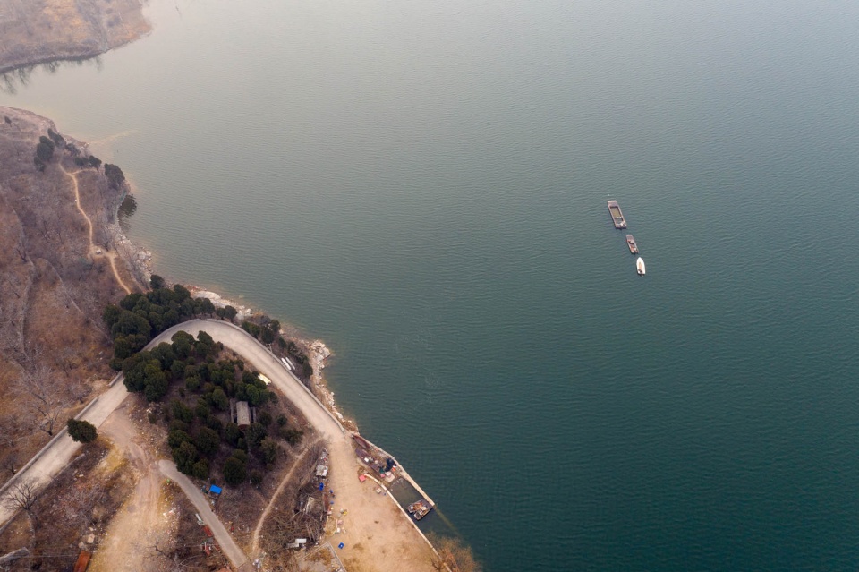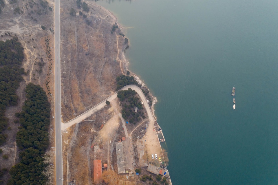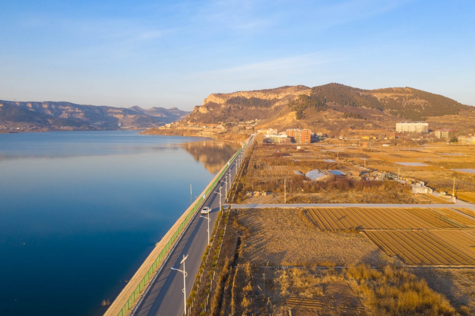 卧虎山水库北侧有一条两车道的公路,在无人机镜头下,笔直的公路将岸边的农田和碧绿的湖水一分为二,看起来非常漂亮。