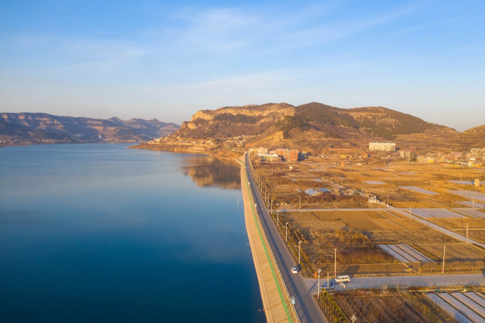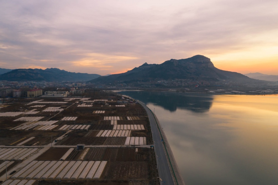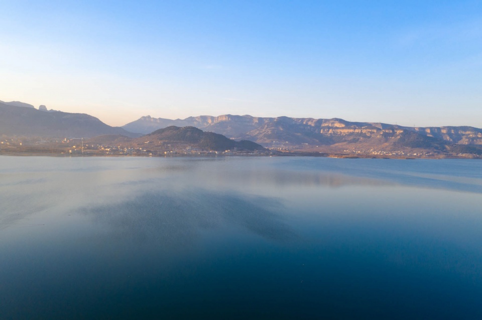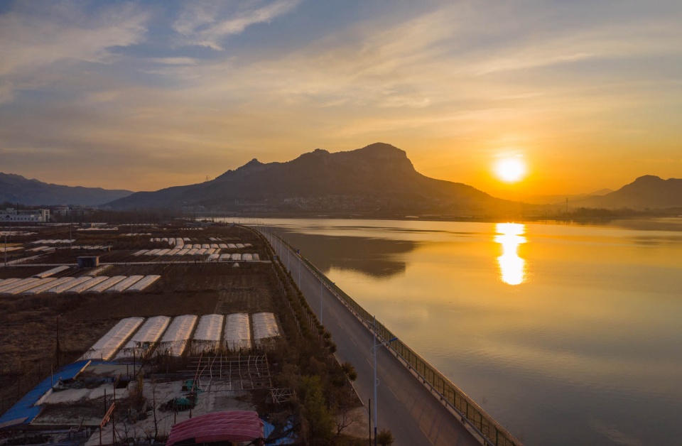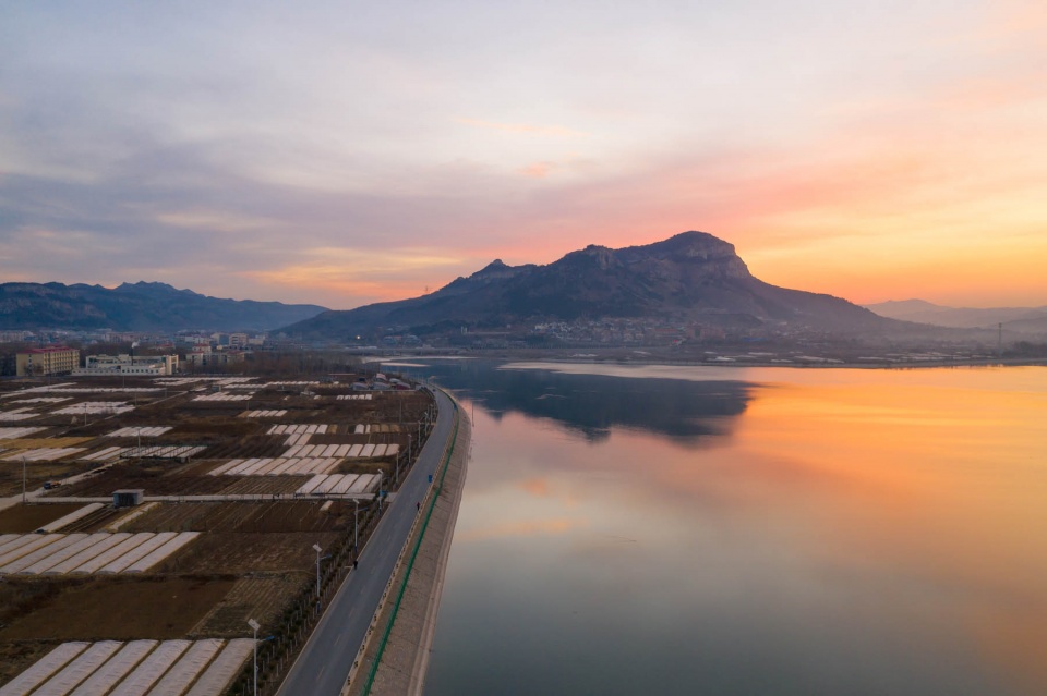 卧虎山水库始建于1958年9月,后来经过改建、扩建、续建和除险加固工程达现规模,水库流域面积557平方公里,是济南市重要的水源地,被称为“济南的大水缸”。图为日出时分航拍卧虎山水库,水天一色风景如画。